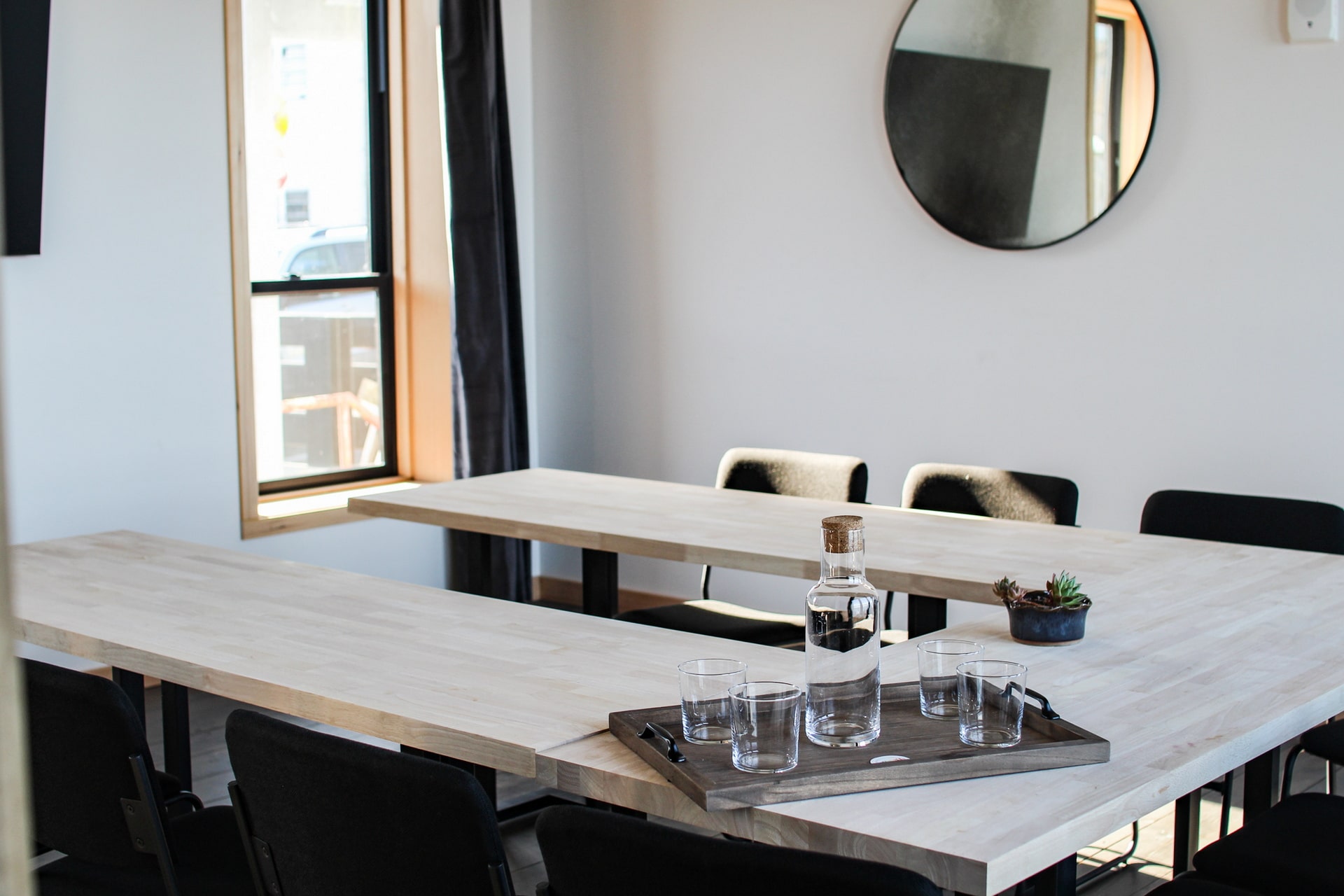A modern conference room with light wooden rectangular tables arranged in a U-shape. Empty glasses and a carafe of water sit on a tray in the center. Dark chairs surround the tables, and a round mirror hangs on the wall. A window lets in natural light.