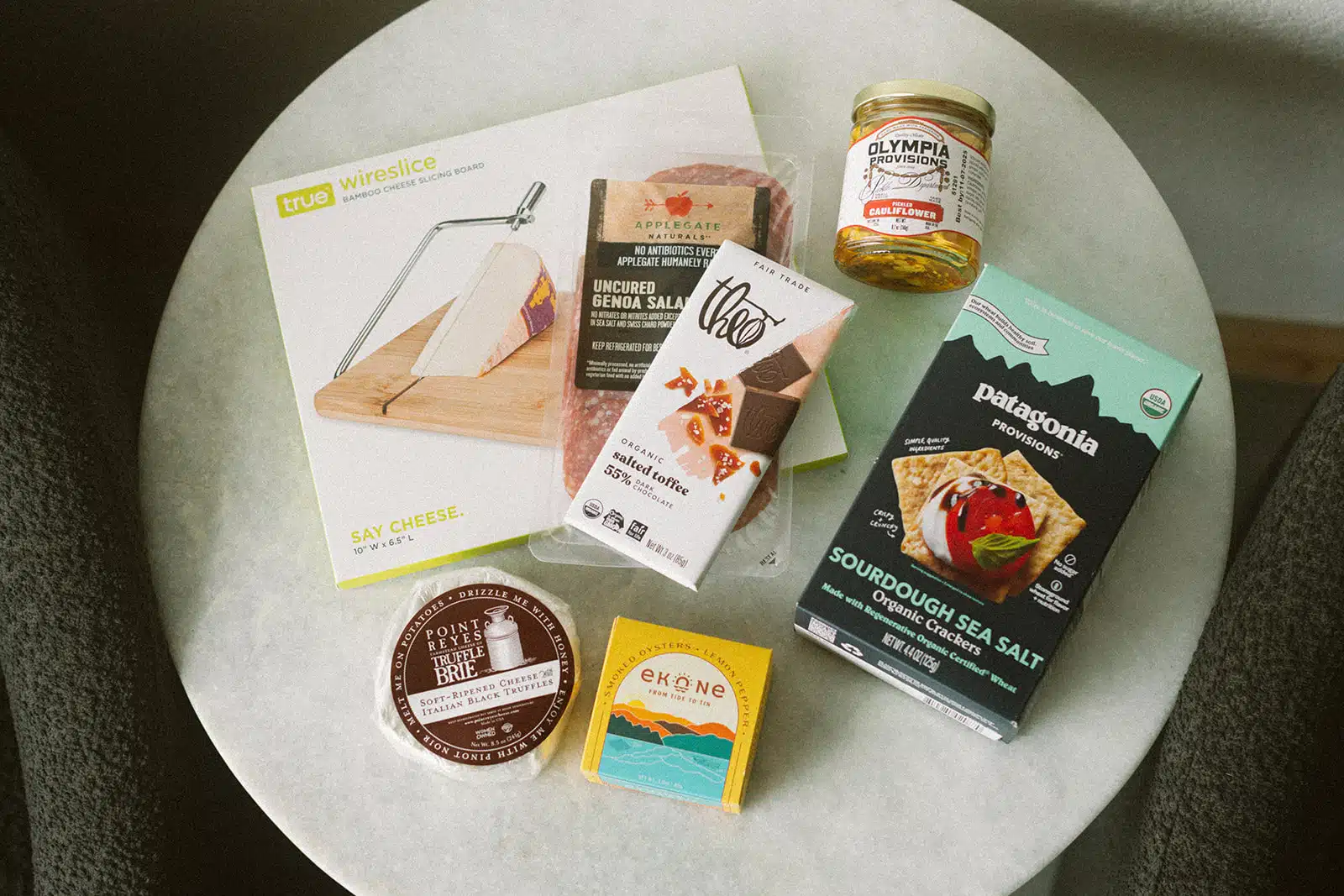 Craft your own coastal charcuterie board with some of our local favorites! Includes a cutting board and slicer.